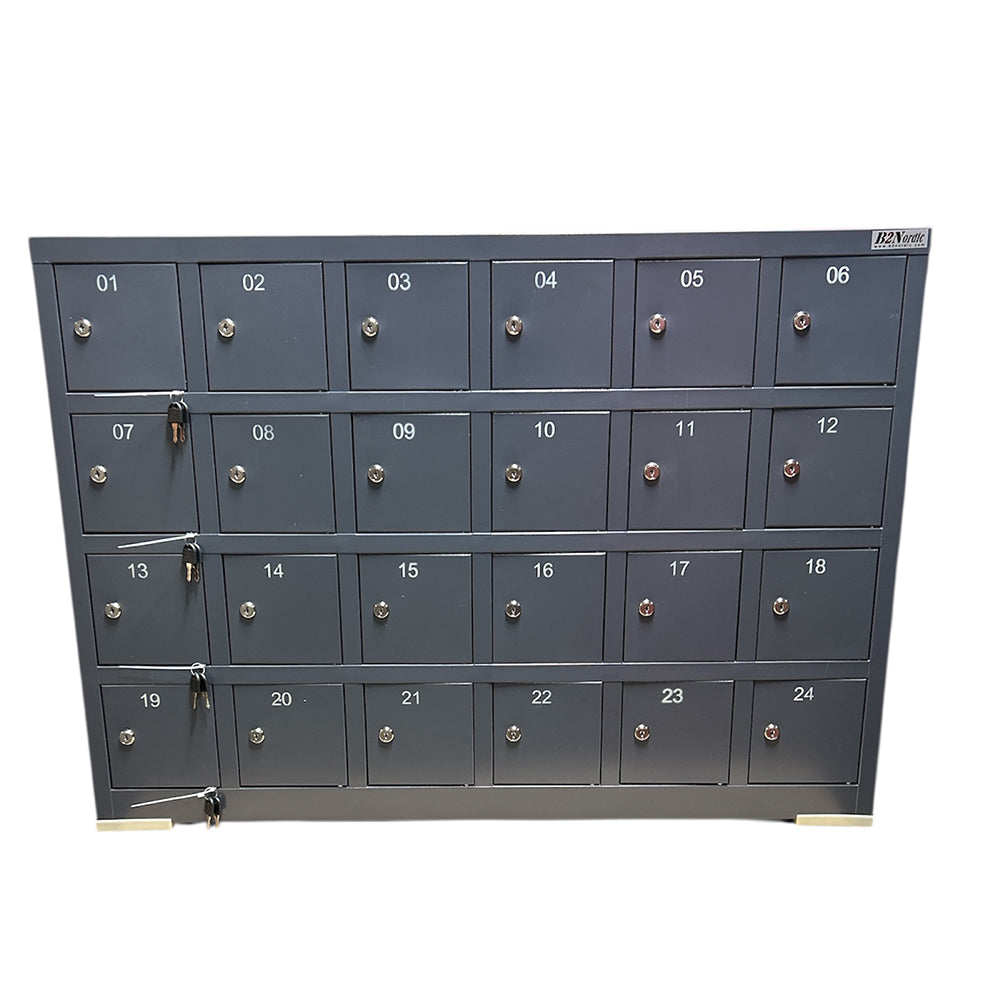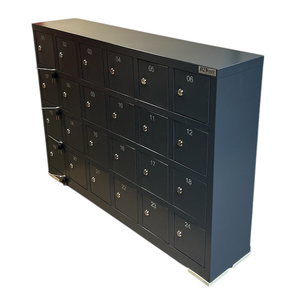 Skåpet har 24 fack med egen lucka för varje telefon, totalt 24 platser